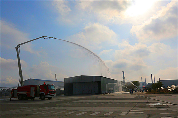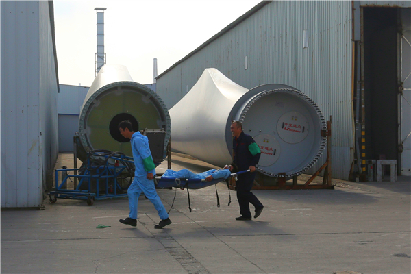 本次演練模擬連云港工廠10#油漆車間因電器隱患發(fā)生火災,導致大量物資和人員被困。9點50分,各參演隊伍集結完畢準備演練。10點整,通訊組接報警、報告火情,第一時間啟動消防應急預案,向119報警后開展初期火災滅火、人員疏散、救護、物資轉(zhuǎn)移、警戒、切斷廠區(qū)雨水排口等搶險工作,葉片生產(chǎn)部機修電工切斷火災現(xiàn)場電源、對儲氣罐進行人工卸壓防范爆炸,消防泵房啟動加壓水泵。隨著火情不斷擴大,模擬的相鄰油漆車間發(fā)生著火,向110、120報警后繼續(xù)組織滅火。10點15分,接警后開發(fā)區(qū)消防救援隊三輛消防車入廠開展滅火救援,期間,通訊組向消防救援隊報告車間可能還有人員,救援隊使用專用工具強行破拆變形大門,對車間內(nèi)部迅速開展搜救,并將被困人員救出。10點20分,火災得到控制并完全滅火,總指揮指示清點人員、盤點物資、檢查損失、檢查消防尾水等工作。