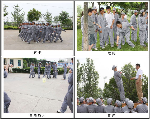 中復(fù)連眾軍事訓(xùn)練在傳統(tǒng)軍訓(xùn)內(nèi)容的基礎(chǔ)上,還融入了背摔、電網(wǎng)、雷陣取水、盲陣等拓展訓(xùn)練的項(xiàng)目。這些拓展項(xiàng)目一方面豐富了軍訓(xùn)貧乏、單調(diào)的內(nèi)容,另一方面加深了新員工之間的相互了解,增強(qiáng)他們的團(tuán)隊(duì)精神和合作意識,通過復(fù)雜而艱巨的拓展項(xiàng)目,員工們之信任、理解、默契與日俱增,這為他們以后出色的完成工作任務(wù)打下了堅(jiān)實(shí)的基礎(chǔ)。