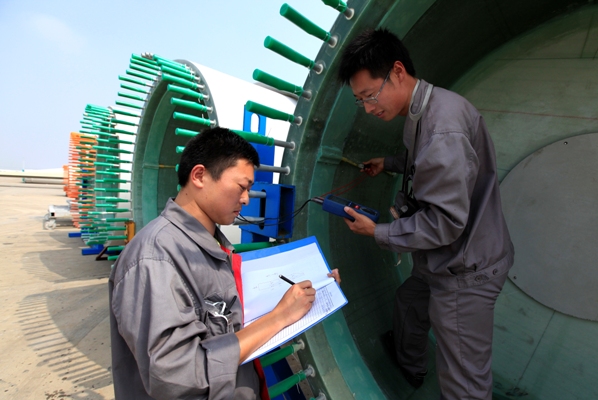 目前中復(fù)連眾生產(chǎn)的葉片最短的有34米,最長的達(dá)到超過60米,這就造成擺放這些葉片的場地非常大,連云港生產(chǎn)基地的貨場大約300畝。廣闊的貨場繞行一周至少需要半個(gè)小時(shí),工作內(nèi)容暫且不說,光是每天在貨場上來回走上幾趟,很多人都吃不消,加上酷暑寒冬,風(fēng)吹雨淋,讓人望而生畏。葉片噴漆完畢到等待發(fā)貨這段時(shí)間,賈效博會將對葉片進(jìn)行航空標(biāo)識、內(nèi)部檢查、后緣厚度、螺栓、葉片翼型檢查、人孔板等14個(gè)大類60多小項(xiàng)的檢查,從根部到尖部,從外表面到葉片內(nèi)里,有的需要肉眼觀察,有的需要儀器測量,需要嚴(yán)格對照工藝要求,逐項(xiàng)檢查,對檢查到的不合格項(xiàng)還要反饋給相關(guān)部門,請他們處理,然后再進(jìn)行一輪檢查,直至符合出廠標(biāo)準(zhǔn)。遇到發(fā)貨時(shí)間比較急,或者是出口訂單,他的任務(wù)就更艱巨了,加班加點(diǎn)不說,對同一只葉片他要看好幾次,確認(rèn)沒有問題了,他才會給客戶監(jiān)理看。